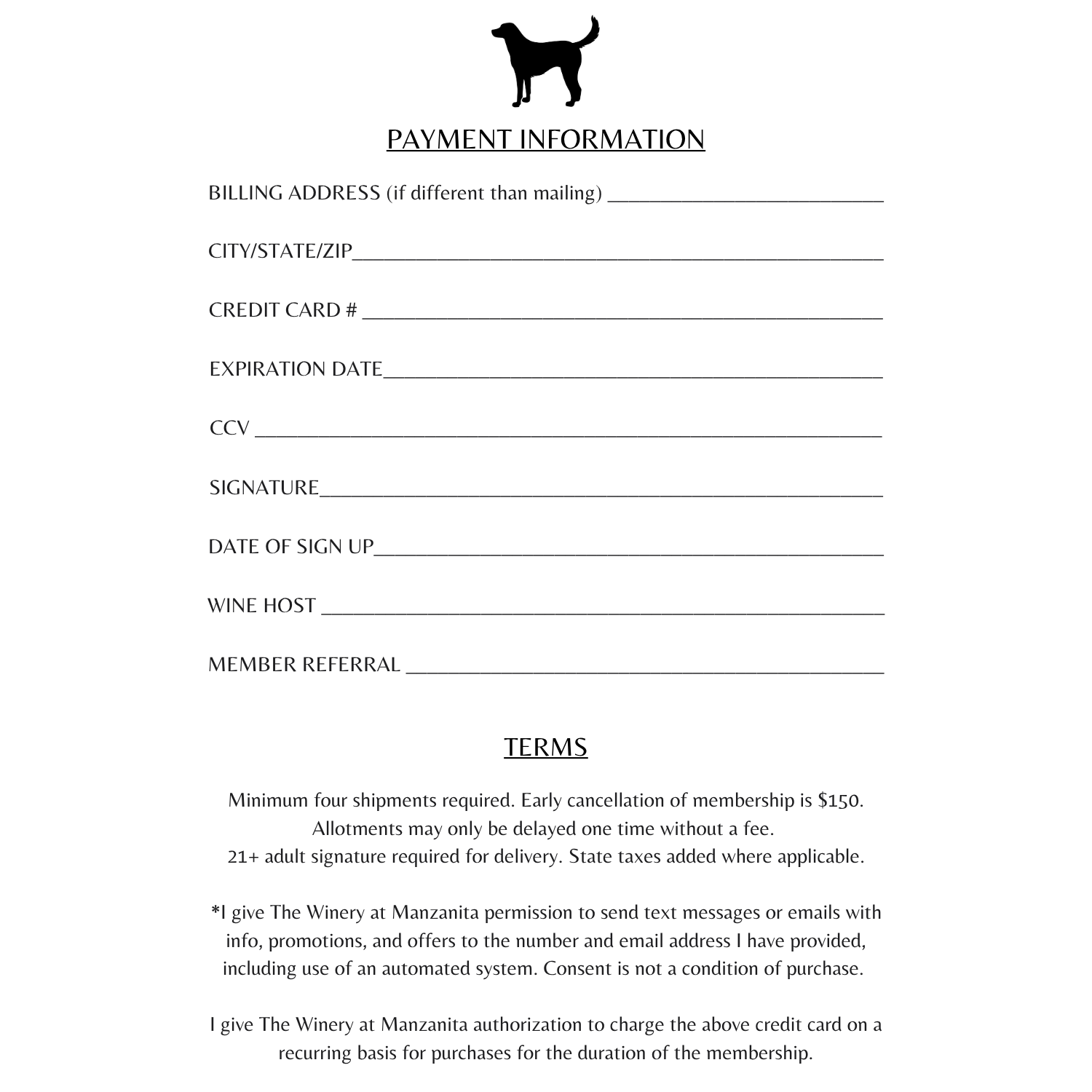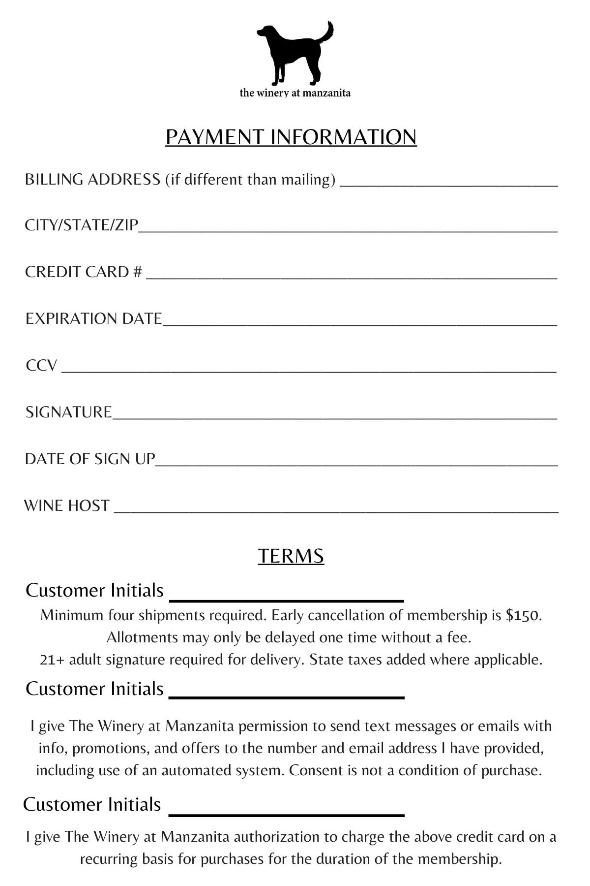 there is a 1-year commitment for the wine club. by joining, you grant the winery at Manzanita permission to charge your credit card for quarterly allotments, which will be listed as Vinoshipper, our fulfillment partner.